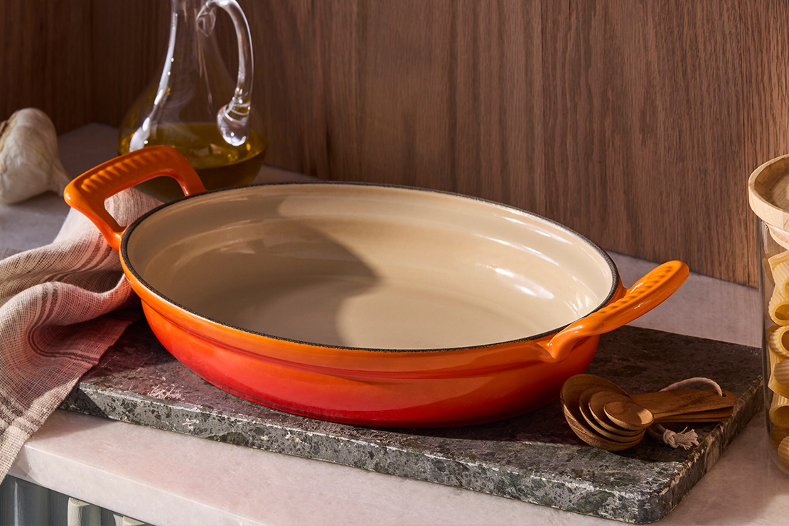 The Oval Baker is ideal for roasting, baking, casseroles, side dishes and more. The shallow, low-profile design allows heat to circulate around the food for optimal browning and crisping, while the longer, oval shape is perfectly sized for pork roasts, sides of salmon and roasting vegetables. Finished with a colorful exterior and open scalloped handles, it's ideal for cooking and serving from stove to oven to table.