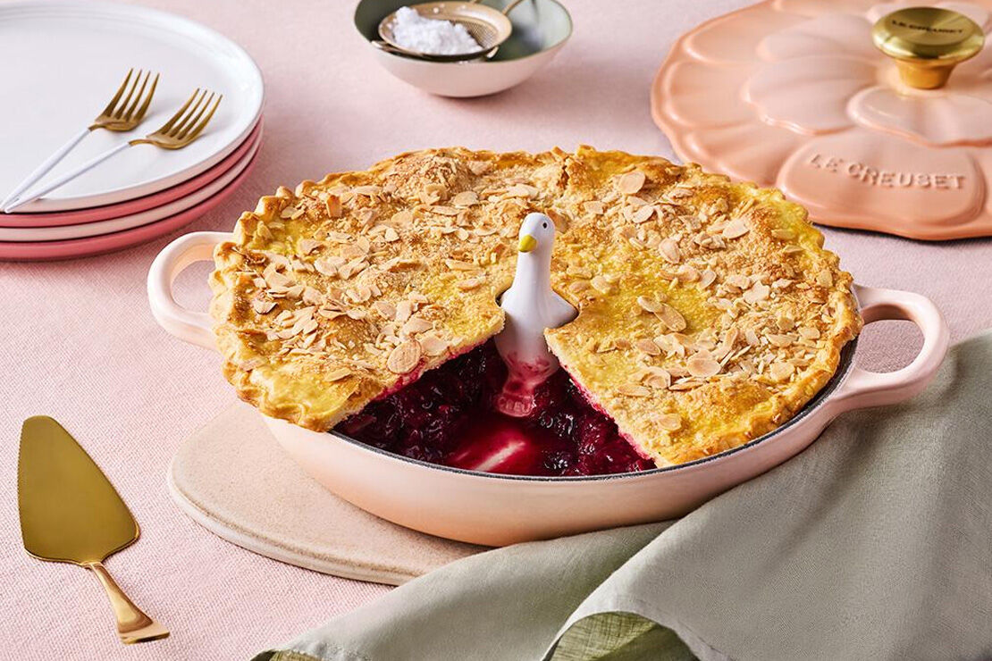 - Roll out the chilled pastry on a lightly floured surface into a large circle, using the lid of the casserole as a guide. Cut the circle slightly larger than the lid, approximately 3-4 mm thick. Cut a small 3cm circle out of the centre of the pastry disk for the Le Creuset Stoneware Pie Vent. Place the Pie Vent in the centre. Place the pastry lid on top of the petal casserole and carefully place the Pie Vent through the pastry hole. Crimp the edges.