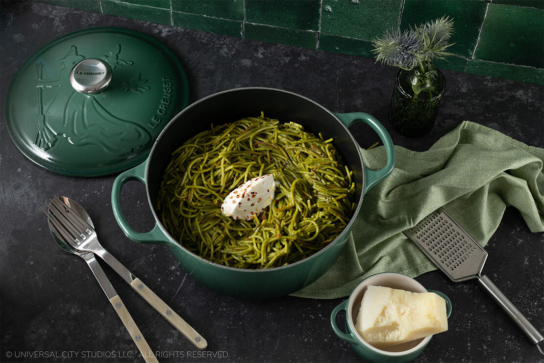 This bold dish is inspired by Elphaba's enchanted broomstick. Spaghetti strands are snapped into bristly lengths and toasted for a deep, nutty flavor. A green sauce is then conjured using toasted pistachios and bitter greens, its edge softened by a ribbon of golden honey. It's a dish that defies gravity with bold and unforgettable flavor that lingers long after it's gone.