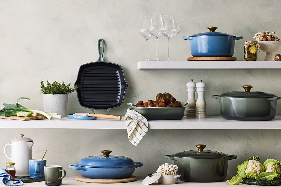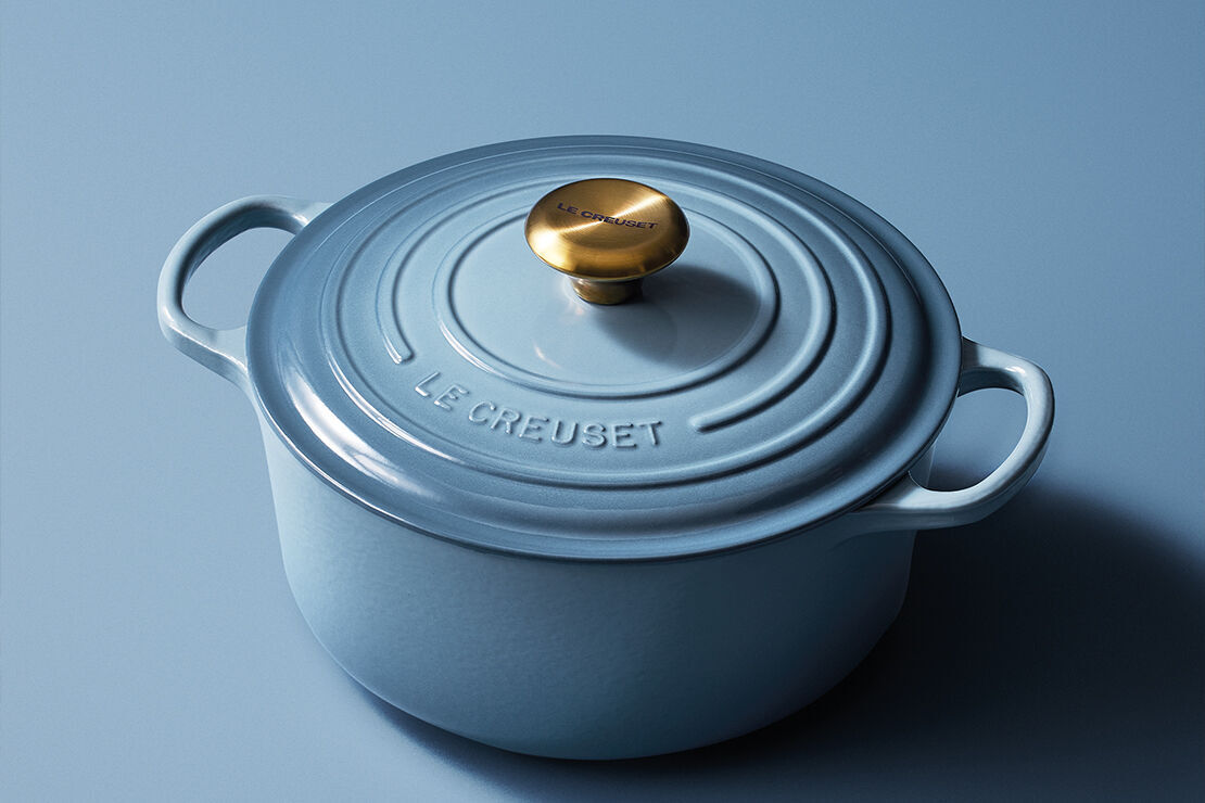 Flame 是 Le Creuset 的標誌性顏色。這種搭配具有極佳的視覺衝擊力,因為它包含了互補色——藍色和橙色。與其他藍色調不同,Chambray 更偏向灰色調,更加柔和,從而呈現出更豐富、更具藝術感的組合。