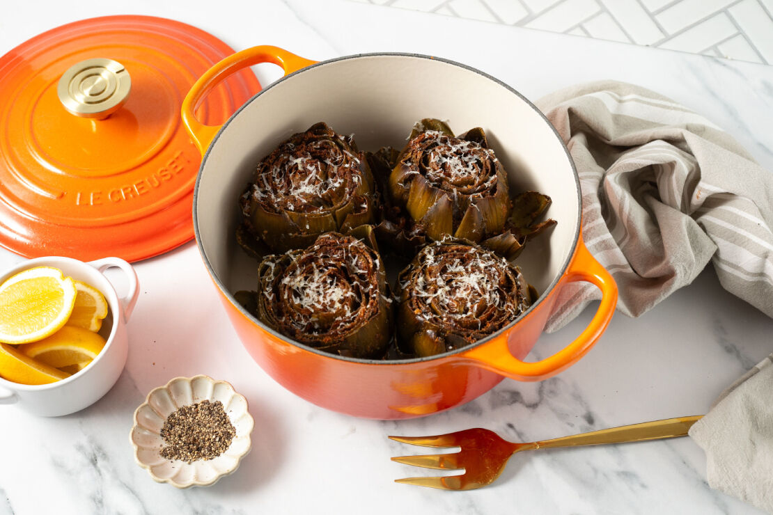 當經典的釀朝鮮薊遇上傳統意大利芝士黑胡椒烹調法令整道菜立即煥然一新。 不要被較長的烹飪時間嚇倒——只需 20 到 30 分鐘的簡單準備,朝鮮薊就會在烤箱中慢慢燉煮至完美,變得鮮嫩、美味。
